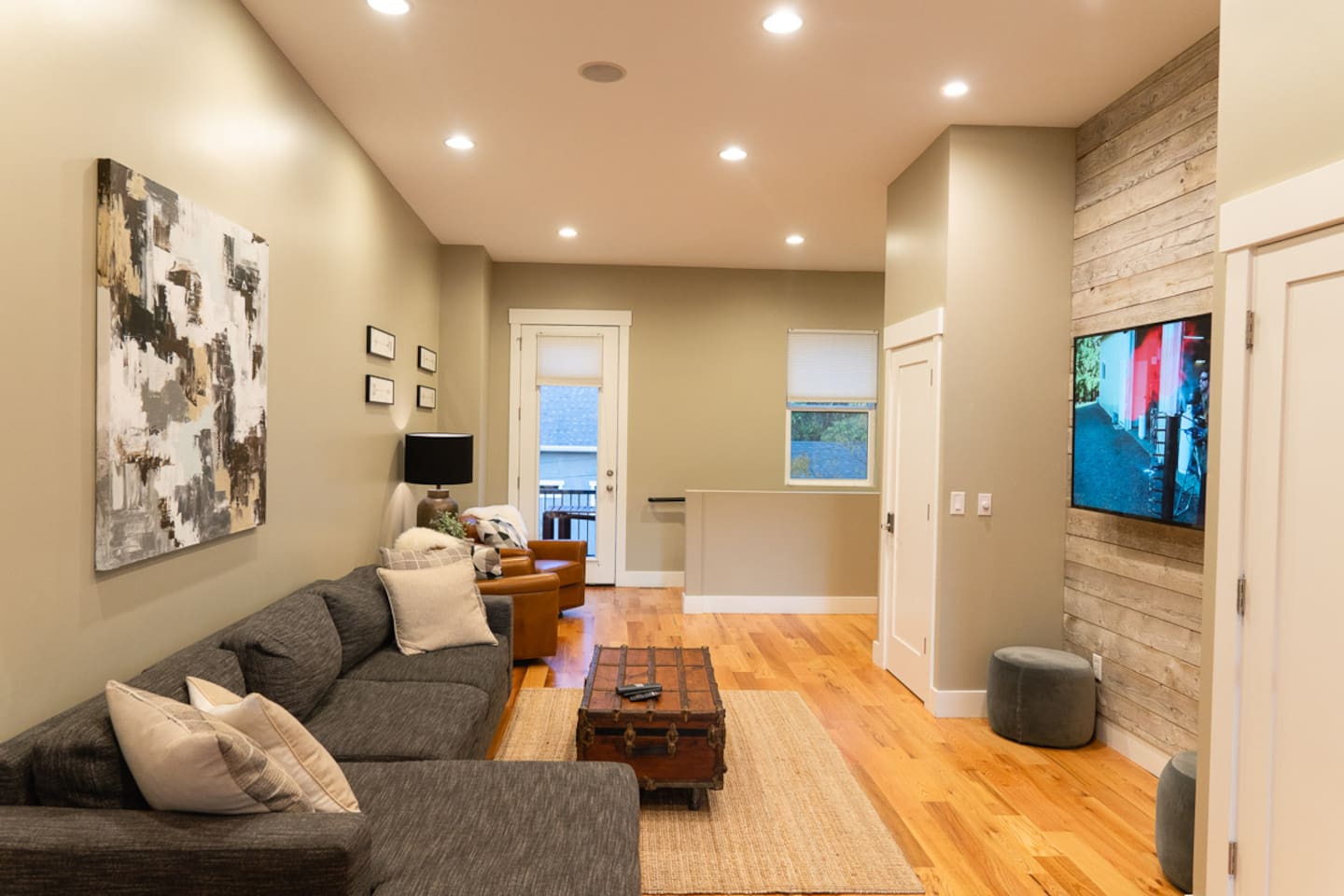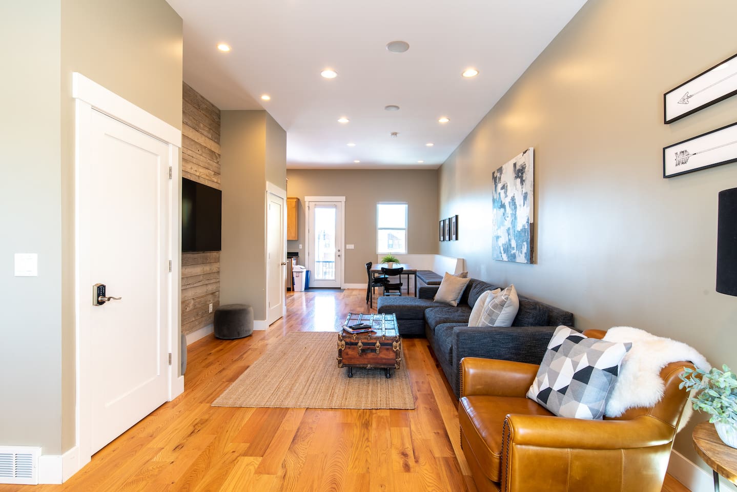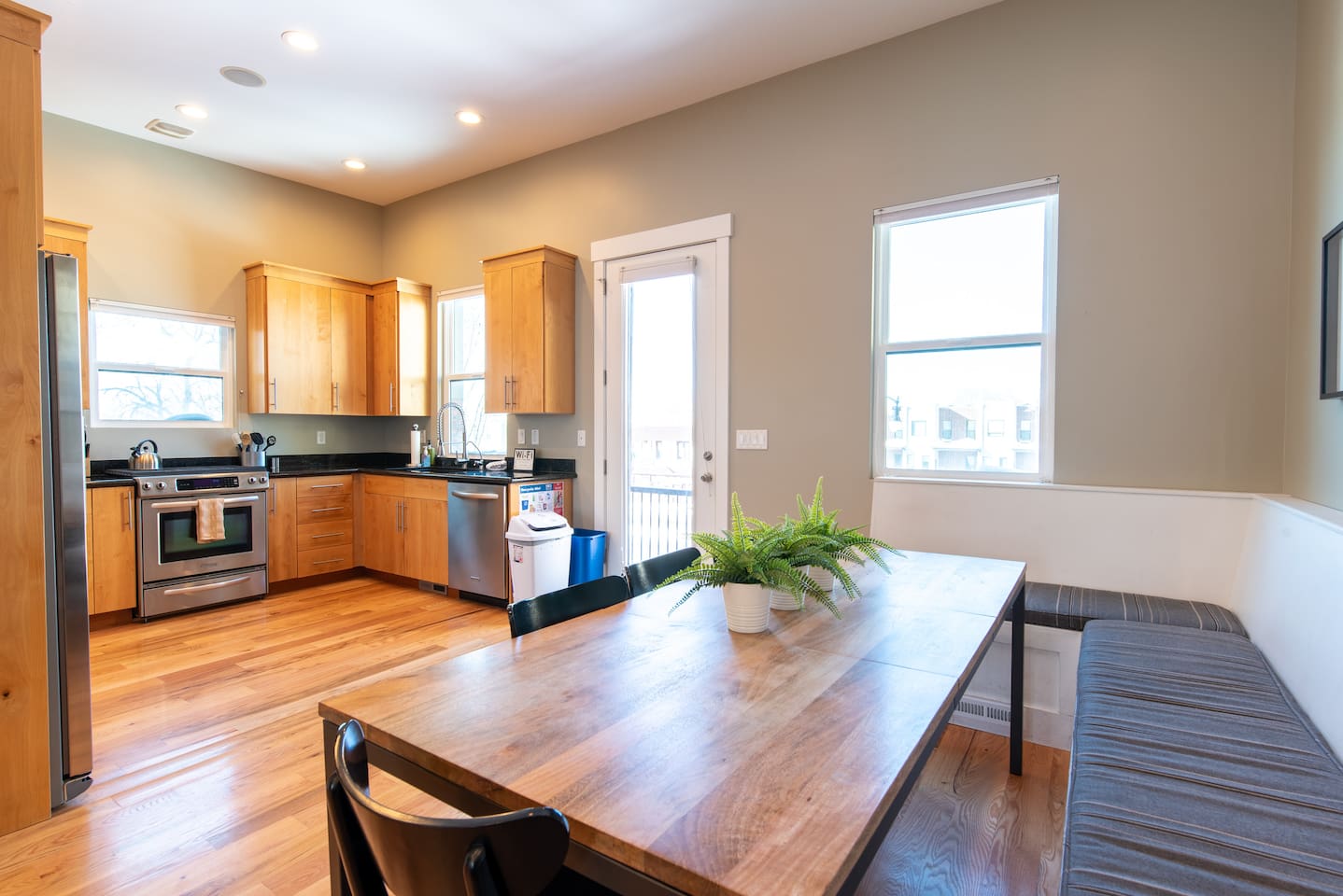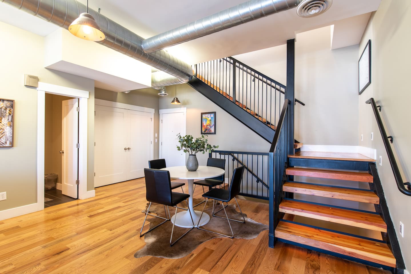 We are very excited to be bringing this property to the Airbnb Market in Salt Lake City. Built in 2009 and with Green materials, this home is more unique and of higher quality than most in the area. The space is truly wonderful! We spent a lot of time working with numerous designers to bring a warm, modern, and extremely stylish space to guests in Salt Lake City. ✯ Ground Floor ✯ features 10-foot ceilings and exposed industrial ducting, accented by a handmade steel and wooden staircase. A 75-inch 4K LED TV is perfect for watching sports games or a movie after an exciting day. Entertaining is made easy with a built in drink center with ice maker and the homes bluetooth enabled built-in home stereo system. ✯ Second Floor ✯ features 10-foot ceilings and is accented by a reclaimed barnwood wall from the backwoods of Idaho. A 65-inch 4K LED TV and a custom built restaurant style kitchen table and bench allow for the entire group to relax on this level. ✯ Bedrooms ✯ all feature high quality, premium pillow top mattresses with soft and firm pillows. - Master Bedroom (second floor): 1 King bed - Guest Bedroom 1 (second floor): 1 Queen bed - Guest Bedroom 2 (basement): 2 Full beds as a bunkbed + air mattress - Guest Bedroom 3 (basement): 2 Queen Beds
